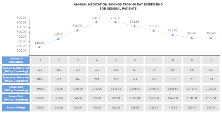 Therefore, for a consumer without a concession card they will require 6 visits compared to 12, saving $180 per medication per year. For a consumer with a concession card, the savings are $43.80 per medication per year.